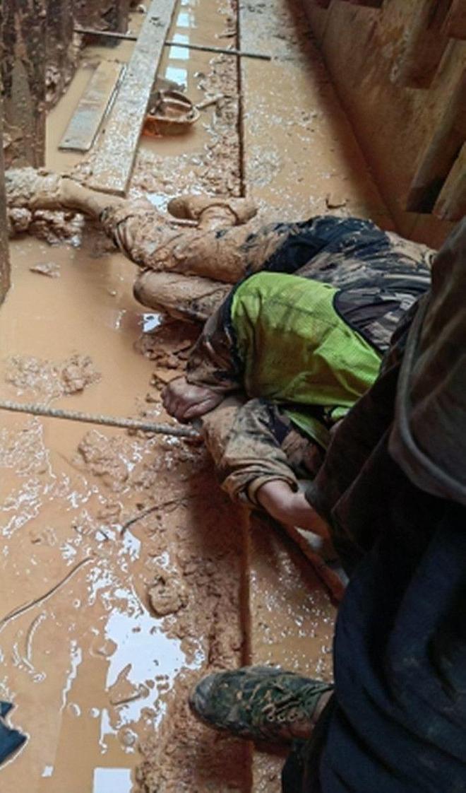 2025年6月22日下午,宋某高在排水渠顶板平台上绑扎钢筋。当日因降雨导致平台表面湿滑,至16时50分左右,宋某高起身准备去取钢筋时不慎滑倒,从平台边缘坠落至基坑底部(图6、7)。