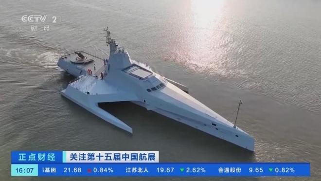 这款新舰的三体设计和之前在航展上曝光的“虎鲸”三体无人艇类似,但可能更大一些。